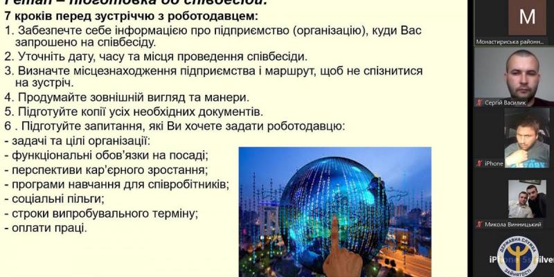 Так, безробітні жителі Монастириського району «побували» на вебінарі «Підготовка до співбесіди з роботодавцем», який провела провідний фахівець з профорієнтації Монастириської районної філії Тернопільського обласного центру зайнятості Уляна Головко.