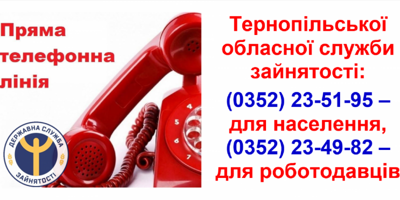 Тернопільська обласна служба зайнятості повідомляє, що у зв'язку з введенням карантину на території всієї держави служба переходить у дистанційний режим роботи. Працює ПРЯМА ТЕЛЕФОННА ЛІНІЯ обласної служби зайнятості: