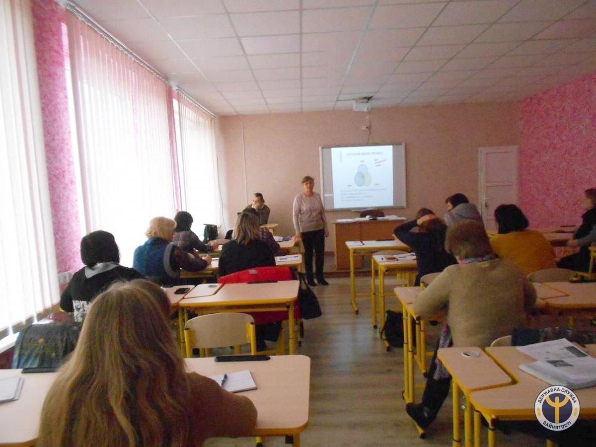Вона ознайомила учасників із сучасними підходами щодо профорієнтації та розвитку кар’єри, звернула увагу на комплекс соціальних послуг у сфері профорієнтації, які надає державна служба зайнятості. Крім того, Ольга презентувала освітянам розроблені профорієнтаційні буклети для спеціалістів, які допомагають юнакам та дівчатам у професійному самовизначенні; роз’яснила, як за допомогою пошукової системи можливо отримати актуальну інформацію про стан ринку праці та найбільш затребувані професії.