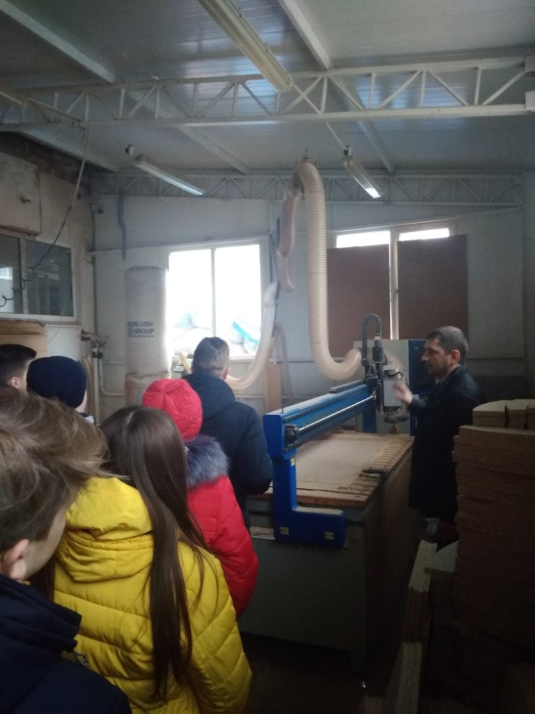 Учні з цікавістю ознайомилися з конструкцією та призначенням верстатів для обробки деревини, технологією виготовлення різних столярних виробів; відвідали цехи для розкрою і облицьовування ДСП, виготовлення каркасів для корпусної та м’якої продукції. У швейному цеху діти побачили весь процес пошиття - від друкованих лекал, розкрою деталей до готових виробів.