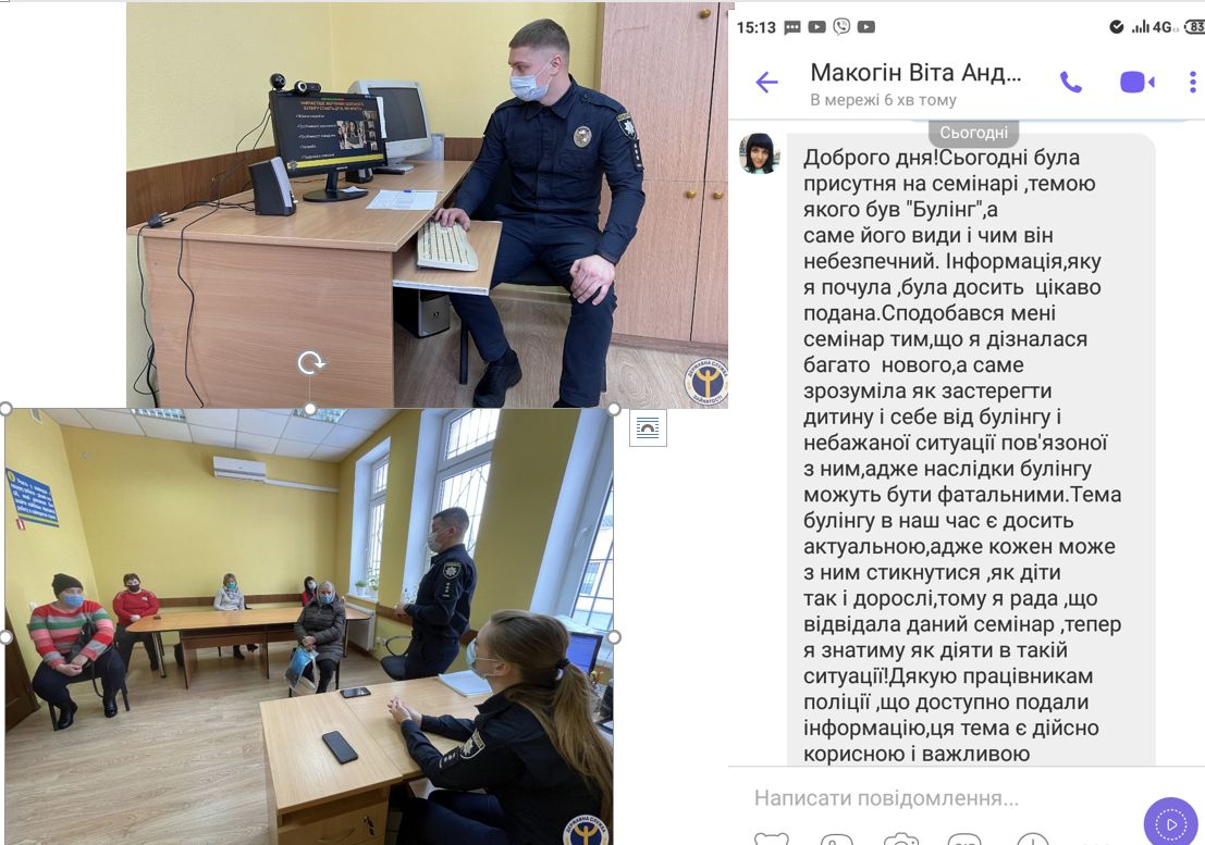 Поліцейські ознайомили учасниць із поняттями «булінг», «мобінг», «кібербулінг», визначили різницю між ними, наголосили на законодавчих моделях попередження та протидії цих явищ.
