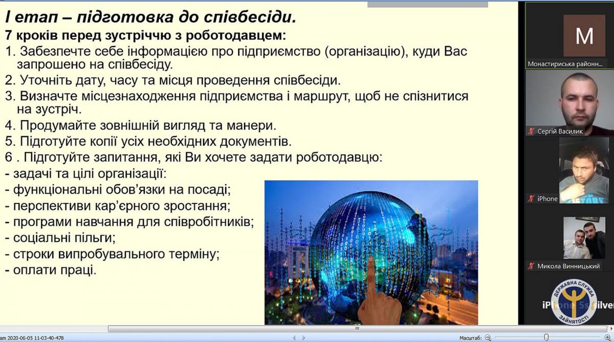 Так, безробітні жителі Монастириського району «побували» на вебінарі «Підготовка до співбесіди з роботодавцем», який провела провідний фахівець з профорієнтації Монастириської районної філії Тернопільського обласного центру зайнятості Уляна Головко.