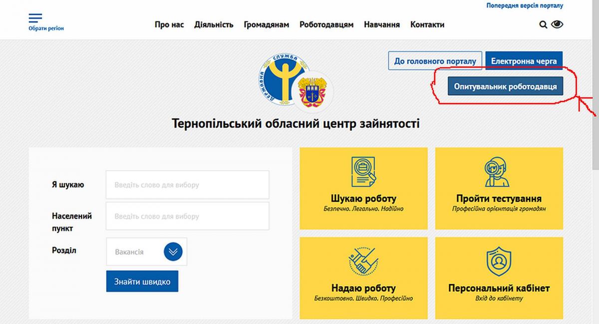 Служба зайнятості не стоїть на місці, а постійно удосконалює та поліпшує соціальні послуги. Ваша думка є важливою для нас! Отож, чекаємо Ваших пропозицій щодо очікуваного вдосконалення послуг ДСЗ - просимо пройти опитування на веб-сторінці Тернопільського обласного центру зайнятості https://ter.dcz.gov.ua/. Для цього потрібно зайти на головну сторінку, справа зверху клікнути на «Опитувальник роботодавця»
