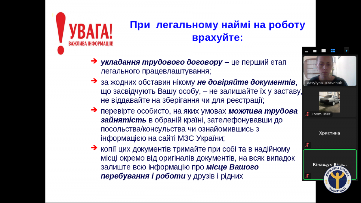 У Теребовлянській районній філії Тернопільського обласного центру зайнятості для 9 безробітних відбувся інформаційний вебінар на тему: «Ризики нелегальної трудової міграції», який провела провідний фахівець з профорієнтації райфілії Василина Кравчук.