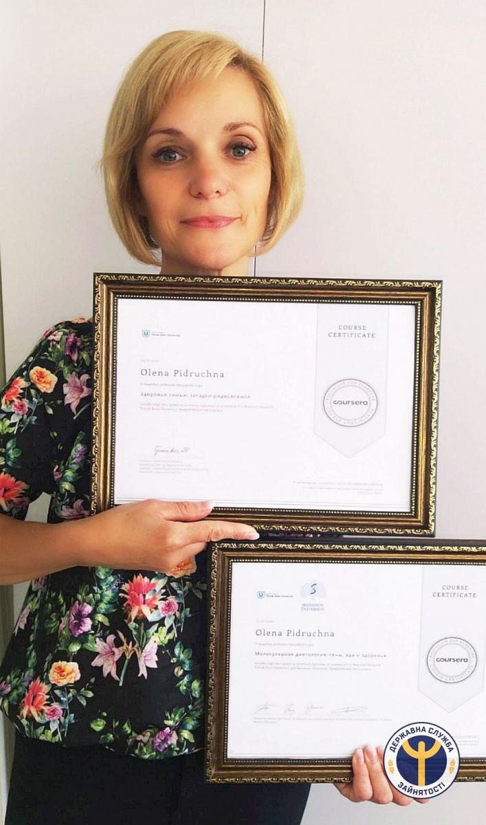Після онлайн-консультації з фахівцем Чортківської районної філії Тернопільського обласного центру зайнятості Олена отримала безкоштовний доступ для реєстрації на платформі Coursera https://www.coursera.org/. Обрала напрямок навчання – «Здоров'я», курс "Молекулярна дієтологія: гени, їжа і здоров'я".